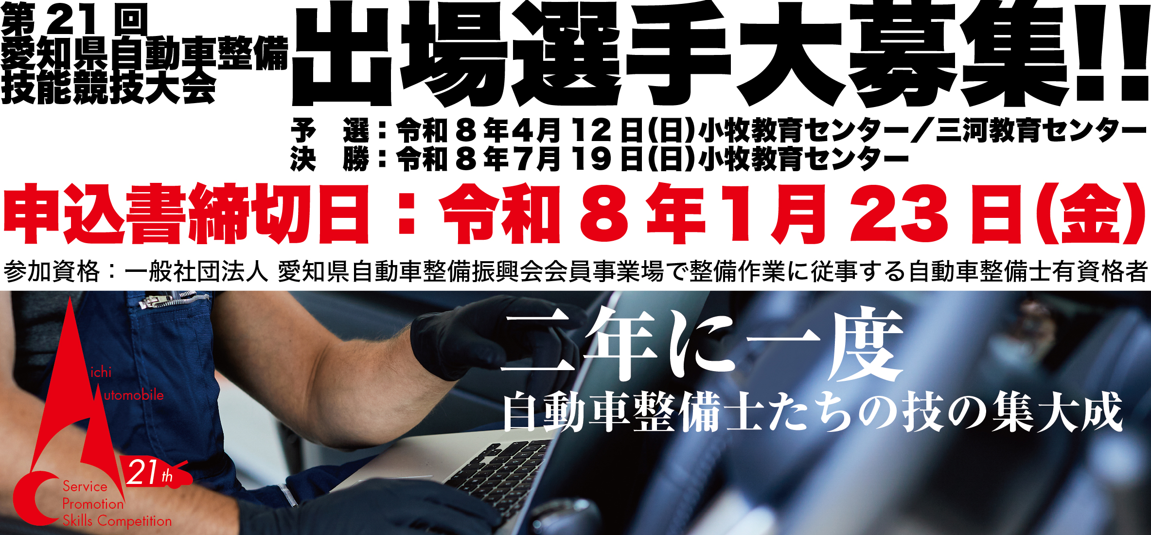 | 1. 参加資格 一般社団法人 愛知県自動車整備振興会会員事業場で整備作業に従事する自動車整備士有資格者とします。 ただし、過去全日本自動車整備技能競技大会入賞者(1位~3位)並びに自動車メーカー及び自動車メーカー系列のメーンディーラー(注)が主催する競技大会(コンテスト)への参加資格を有する事業場に所属する従業員の方は除きます。 (注)メーンディーラーとは、自動車メーカーと特約販売店契約を締結し、新車を仕入れる企業を言う。 |