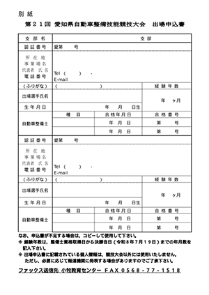 | FAX 0568-77-1518 1支部何チームでも出場可能です。 また、チーム編成が2支部に渡る場合は、いずれかの支部長よりお申込みください。なお、申込みは1事業者1チームとします。 |